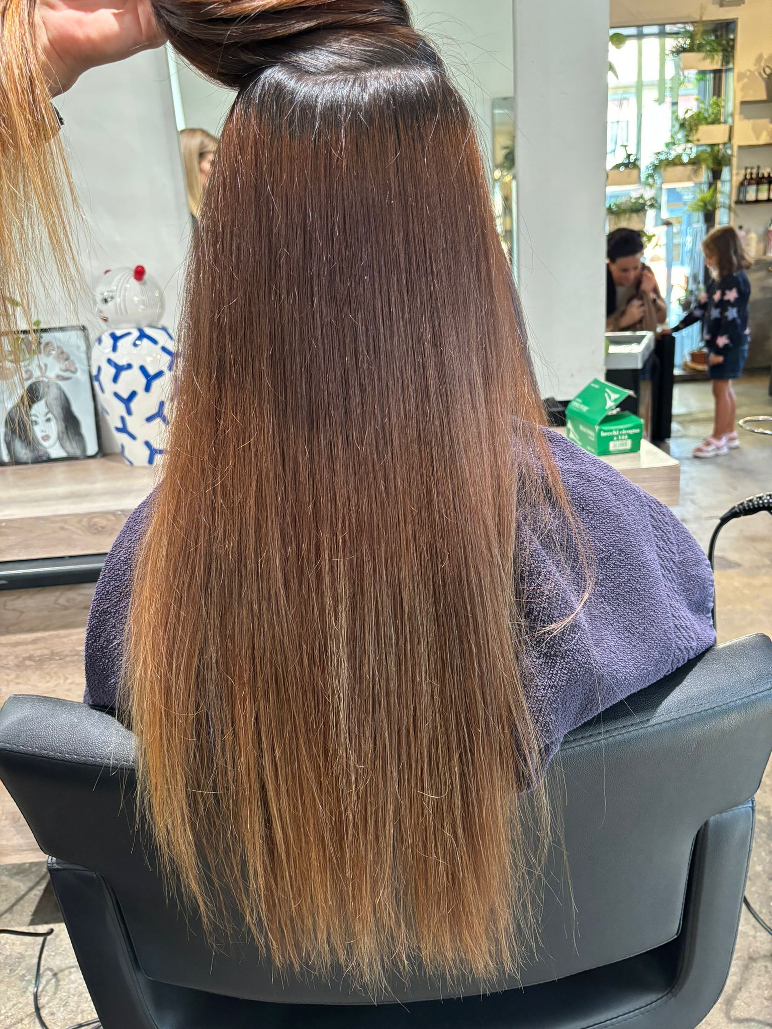 La trasformazione non si conclude con il primo intervento: il vero segreto sta nella manutenzione a lungo termine. Grazie alla tecnica Airtouch e ai riflessanti, ogni due mesi sarà sufficiente un piccolo ritocco per mantenere il colore fresco e naturale. Questo approccio permette al suo colore naturale di crescere gradualmente, fondendosi perfettamente con le schiariture senza il bisogno di ritoccare costantemente la base con tinture.